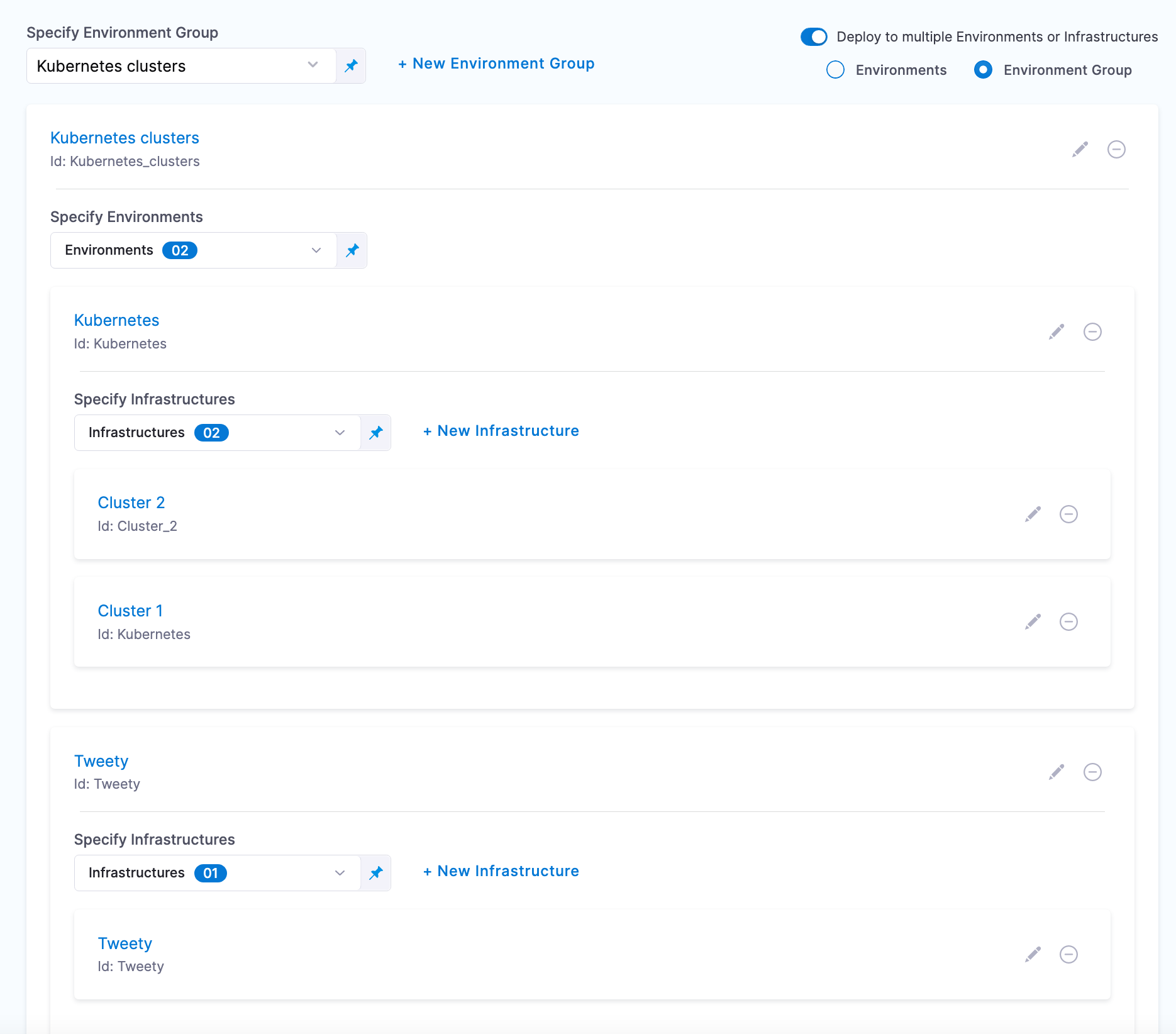 Here's an example with an environment group containing two environments. One environment has two infrastructures and the other has one infrastructure.